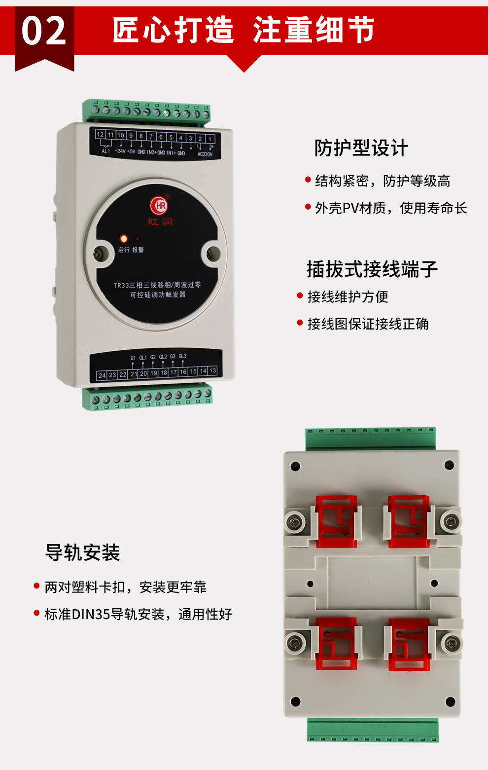 虹潤公司是專業(yè)生產(chǎn)移相觸發(fā)器的國家專精特新“小巨人”企業(yè),生產(chǎn)的移相觸發(fā)器,具有采用光電隔離設計,自動同步功能,過流保護技術,電源缺相檢測,信號超限報警等特點。產(chǎn)品獲得巡回檢測顯示方法及裝置、儀表殼體等2項國家發(fā)明專利,主持起草工業(yè)過程控制系統(tǒng)用模擬輸入兩位或多位輸出儀表、物聯(lián)網(wǎng)智能溫度儀表通用技術條件等2項國家標準以及通信系統(tǒng)多通道數(shù)據(jù)采集控制終端規(guī)范軍用標準,參與國際5G標準制定,取得外置移相觸發(fā)器等2項相關軟件著作權。產(chǎn)品廣泛應用于工業(yè)溫控、電極控制、航天軍工、電爐溫控、食品醫(yī)藥等諸多領域。