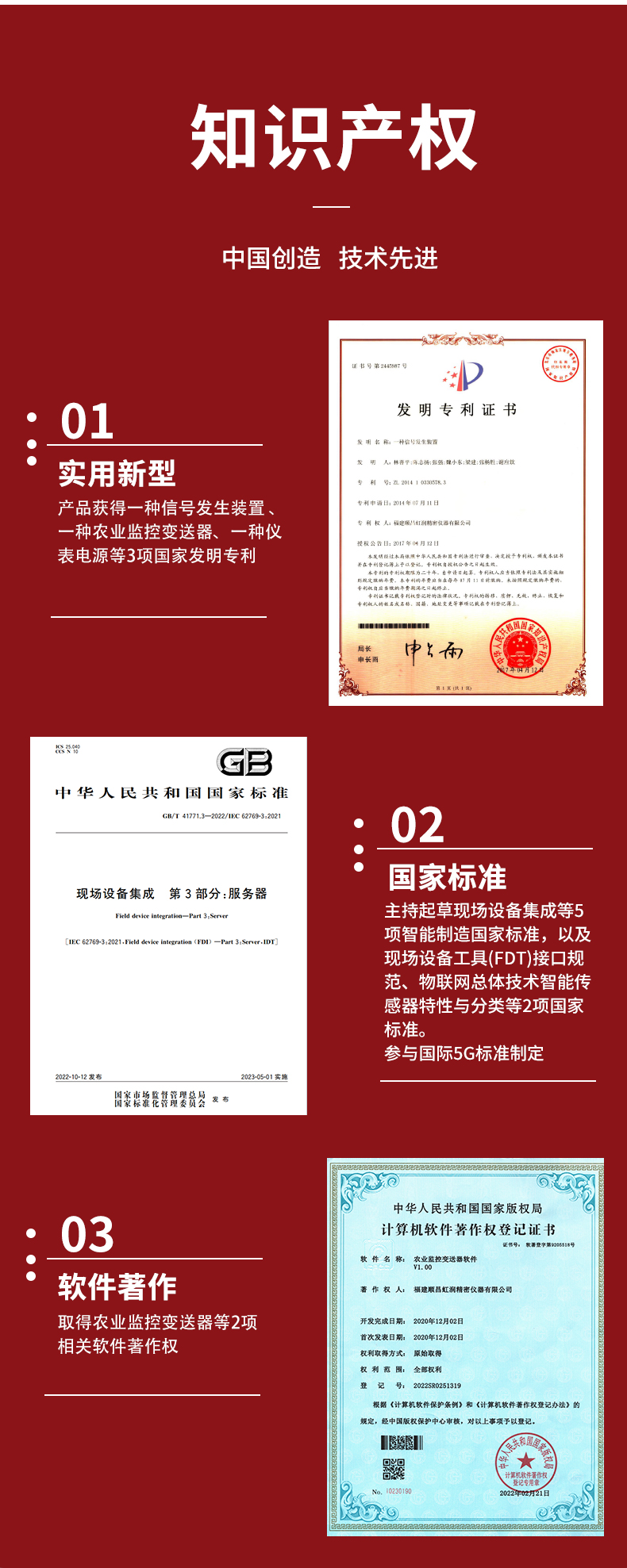 虹潤公司是專業(yè)生產(chǎn)環(huán)境監(jiān)測儀表的國家專精特新“小巨人”企業(yè)。生產(chǎn)的氧氣變送器,具有采用電化學(xué)原理,響應(yīng)靈敏,準確度高,低功耗,模擬量變送輸出或RS485通訊等特點。產(chǎn)品獲得一種農(nóng)業(yè)監(jiān)控變送器、一種儀表電源等2項實用新型專利,主持起草現(xiàn)場設(shè)備集成等5項智能制造國家標準,以及現(xiàn)場設(shè)備工具(FDT)接口規(guī)范、物聯(lián)網(wǎng)總體技術(shù)智能傳感器特性與分類等2項國家標準,參與國際5G標準制定,取得農(nóng)業(yè)監(jiān)控變送器等3項相關(guān)軟件著作權(quán)。產(chǎn)品廣泛應(yīng)用于機房、配電站、地下車庫、工廠倉庫、食品儲存、養(yǎng)殖場、果蔬林園等環(huán)境場合對氧氣濃度的檢測。